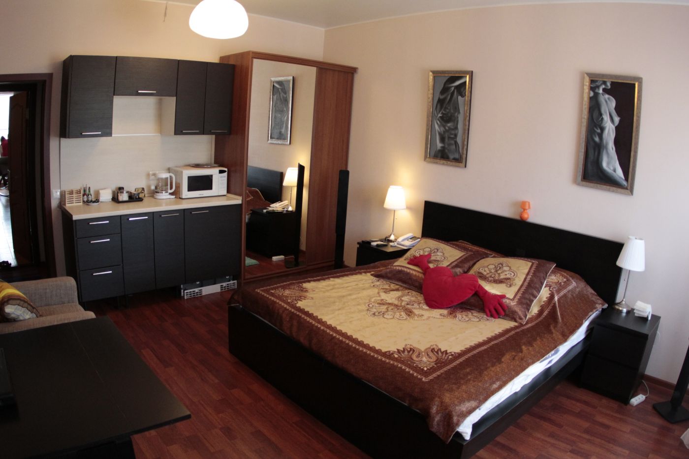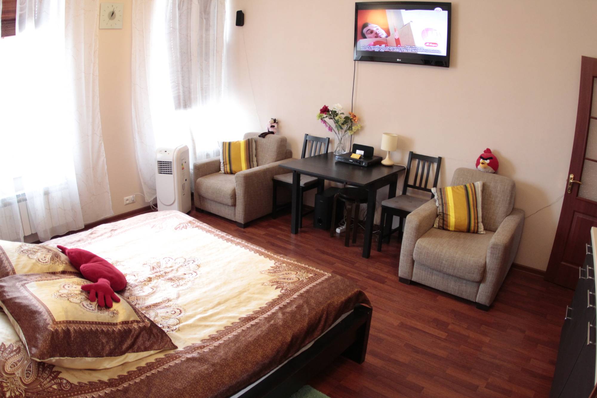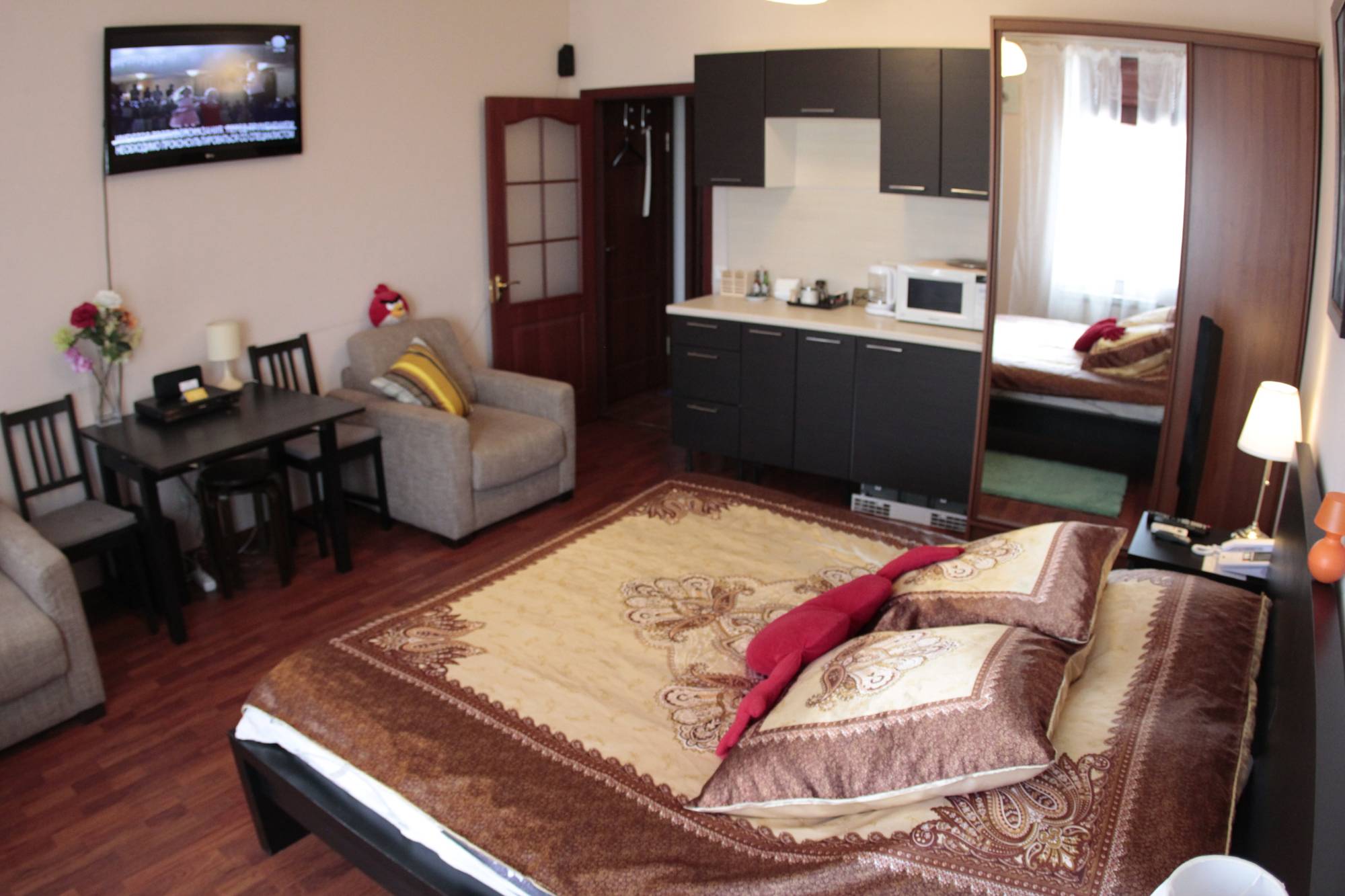 В комнате центральное отопление, деревянный/Паркетный пол, обеденный/рабочий стол, кухонные принадлежности, москитная сетка, шкаф/гардероб с большим зеркалом, удобные кресла, вешалка для одежды, вешалка для сушки одежды, корзины для мусора.