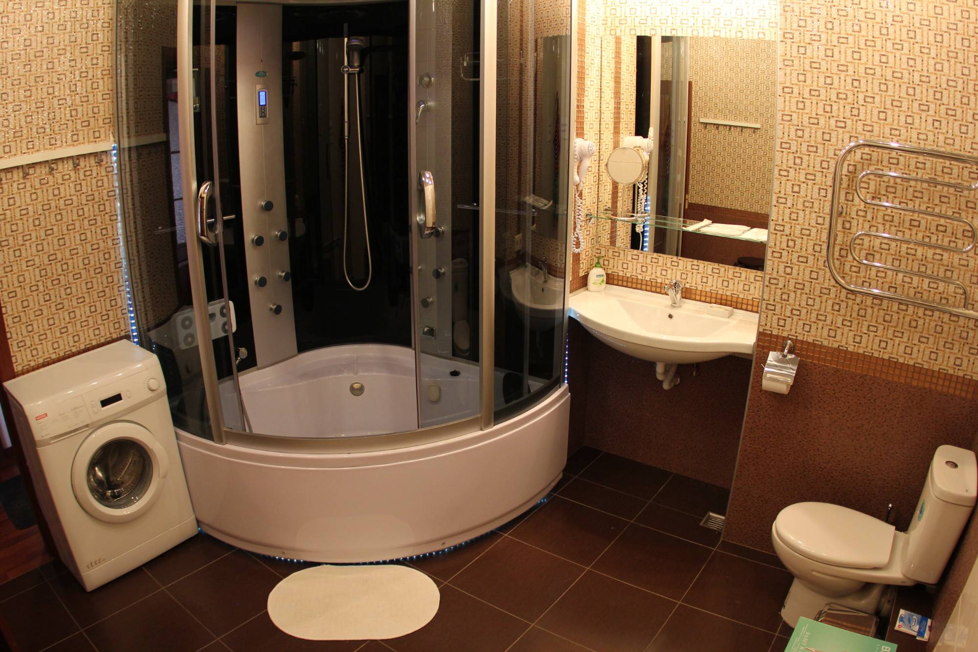 В гардеробе сейф с возможностью хранения ноутбука, утюг, гладильная доска, дополнительное одеяло и подушка. Собственная просторной ванная комната с большого размера душевой кабиной/ванной (одновременно). Современная (прям в ванной комнате) стиральная машина и фен.