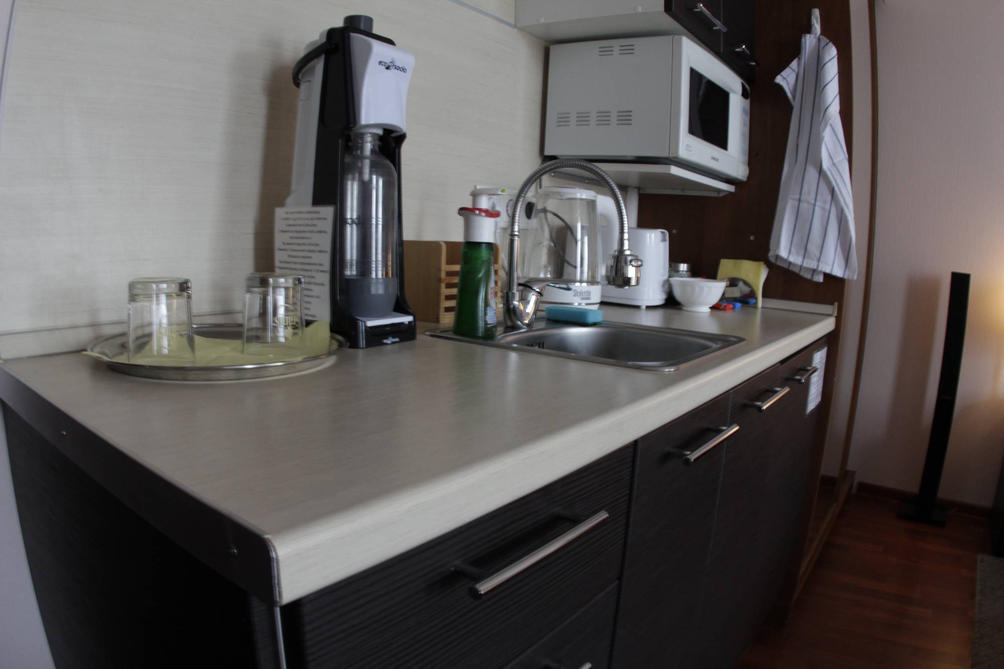 Дополнительный электро подогреватель, вентилятор с дистанционным управлением. Прям в комнате есть мини кухня с мойкой и электро плиткой, полноценный холодильник, электро чайник, СВЧ (микроволновка), газировальный аппарат (для приготовления домашнего лимонада), тостер, комплект посуды/тарелок/стаканов/бокалов.