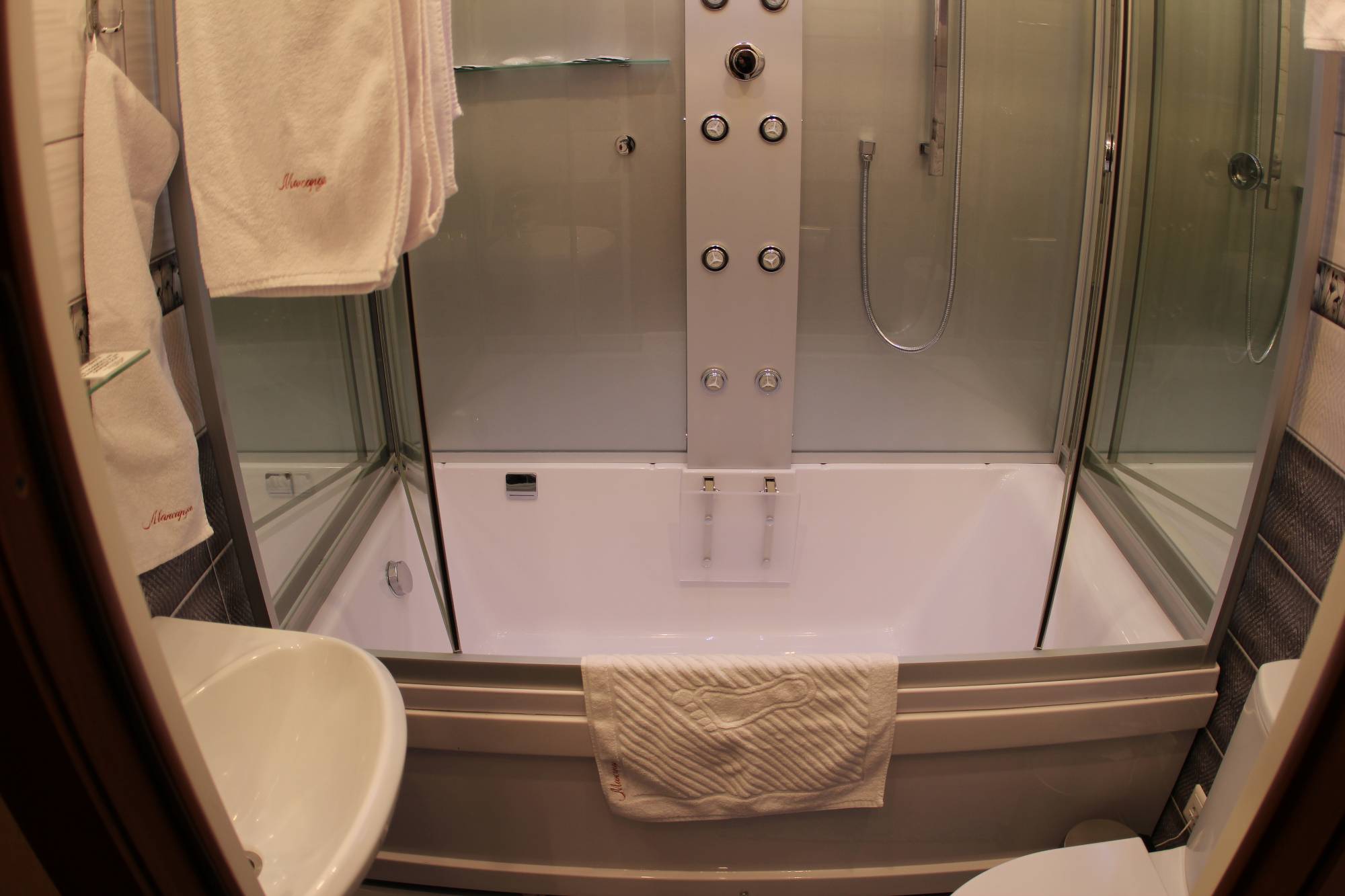 так же в гардеробе есть сейф. В комнате собственная удобная ванная комната с душевой кабиной/ванной одновременно, феном,полотенцосушителем. Перед заездом ванная комната комплектуется комплектом полотенец (по 2 шт на каждого гостя + одним для рук и одним для ног) , а так же (однократно) комплектом туалетных принадлежностей для каждого гостя (туалетная бумага, гель для душа/волос, одноразовыми зубными щетками, мылом, расческой, шапочкой для душа (1-шт.).