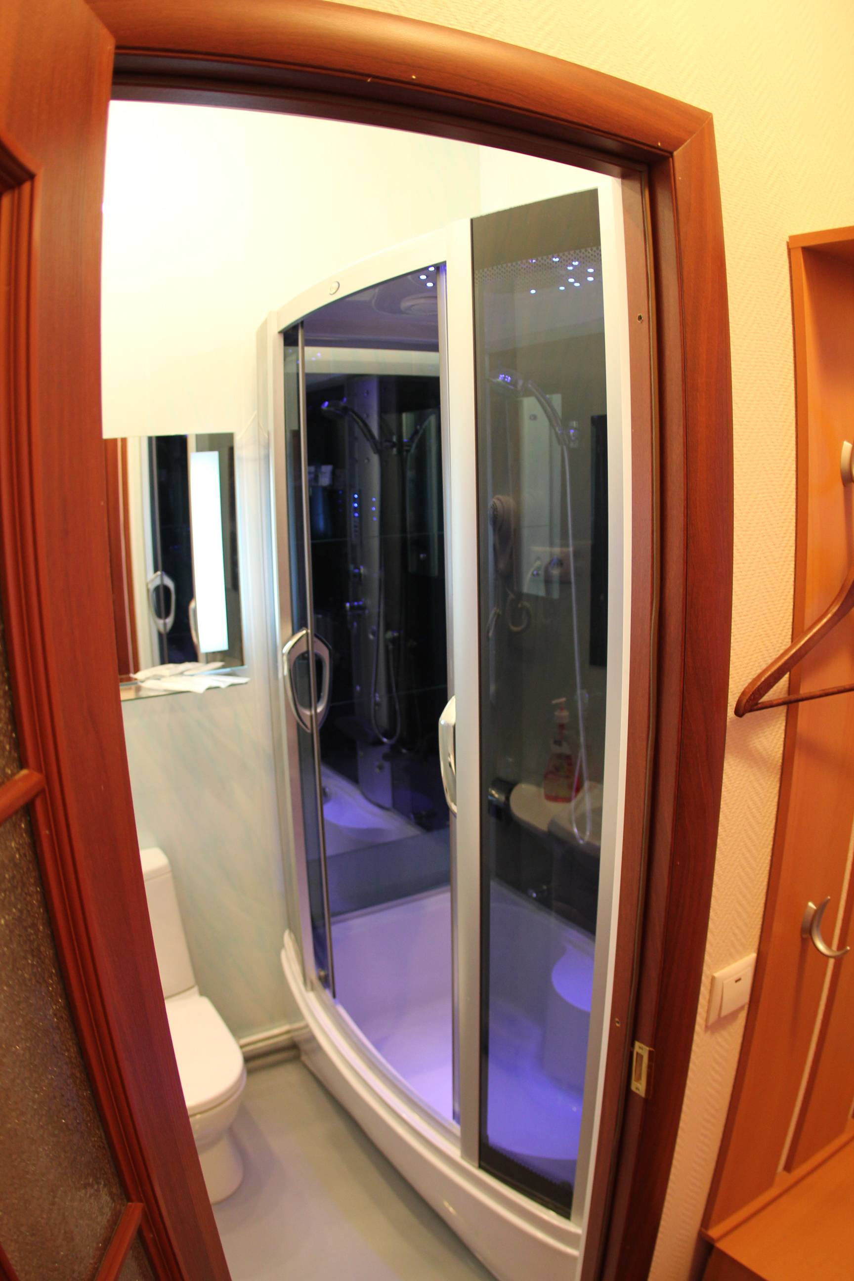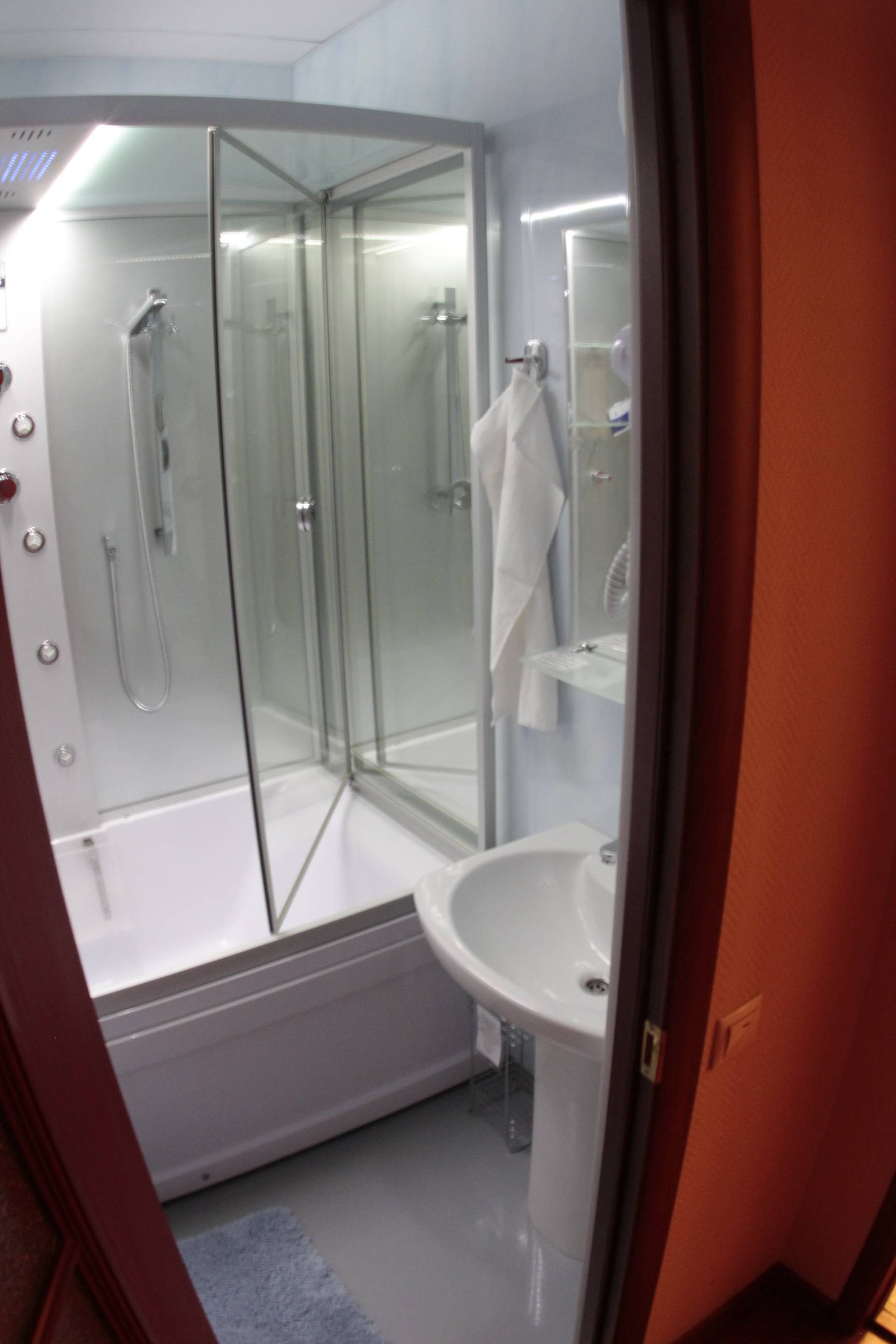 В комнате собственная ванная комната с душевой кабиной, феном. Перед заездом ванная комната комплектуется комплектом полотенец (по 2 шт на каждого гостя + одним для рук и одним для ног) , а так же (однократно) комплектом туалетных принадлежностей для каждого гостя (туалетная бумага, гель для душа/волос, одноразовыми зубными щетками, мылом, расческой, шапочкой для душа (1-шт.).